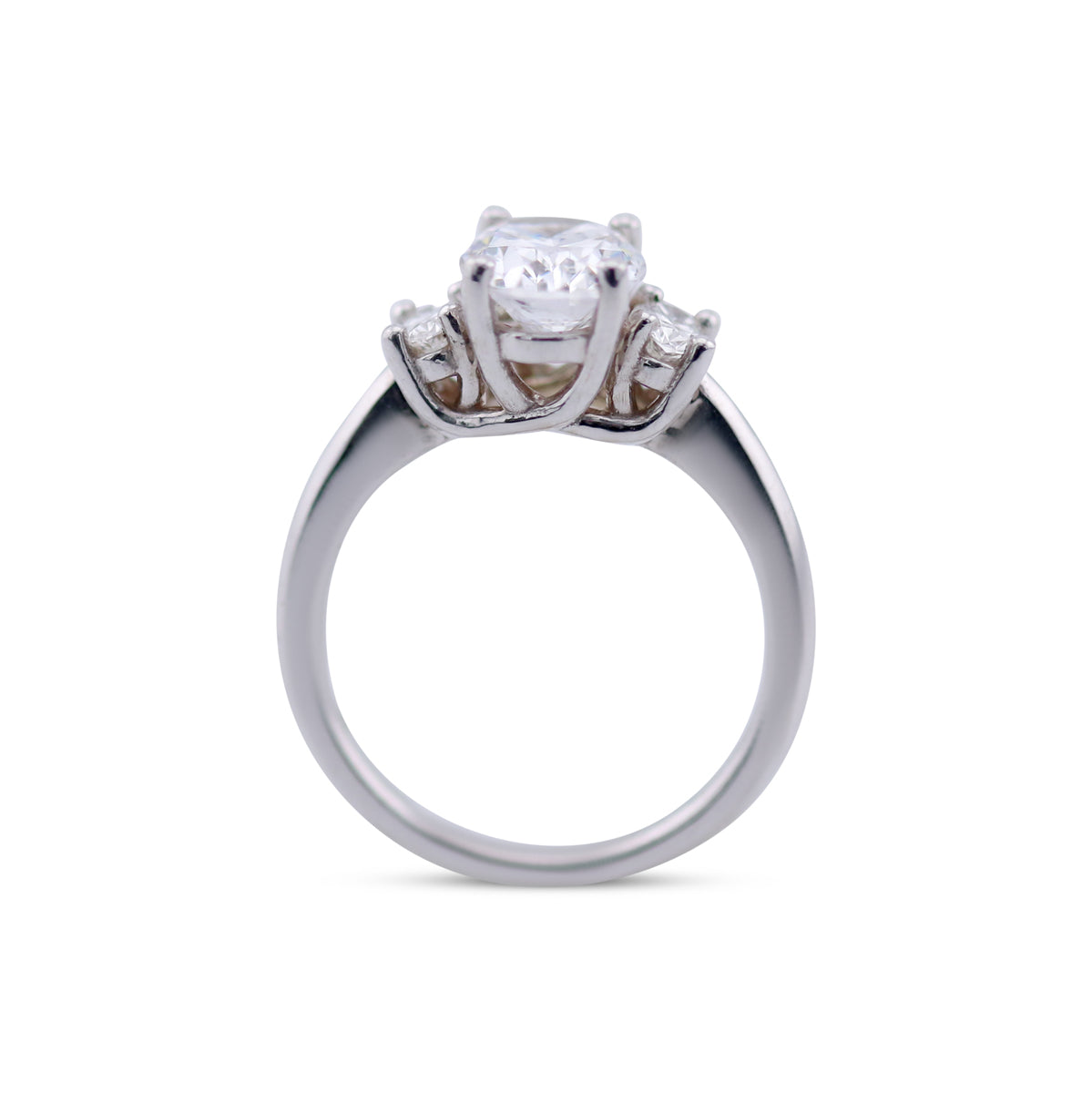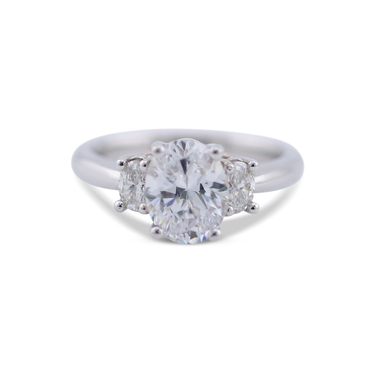 A timeless silhouette with graceful presence, this three stone design celebrates past, present, and future in luminous balance. Crafted in 14 karat white gold, an oval stone of your choosing is framed by 0.50 carats of oval diamonds. Refined and meaningful, it offers classic brilliance with modern polish.