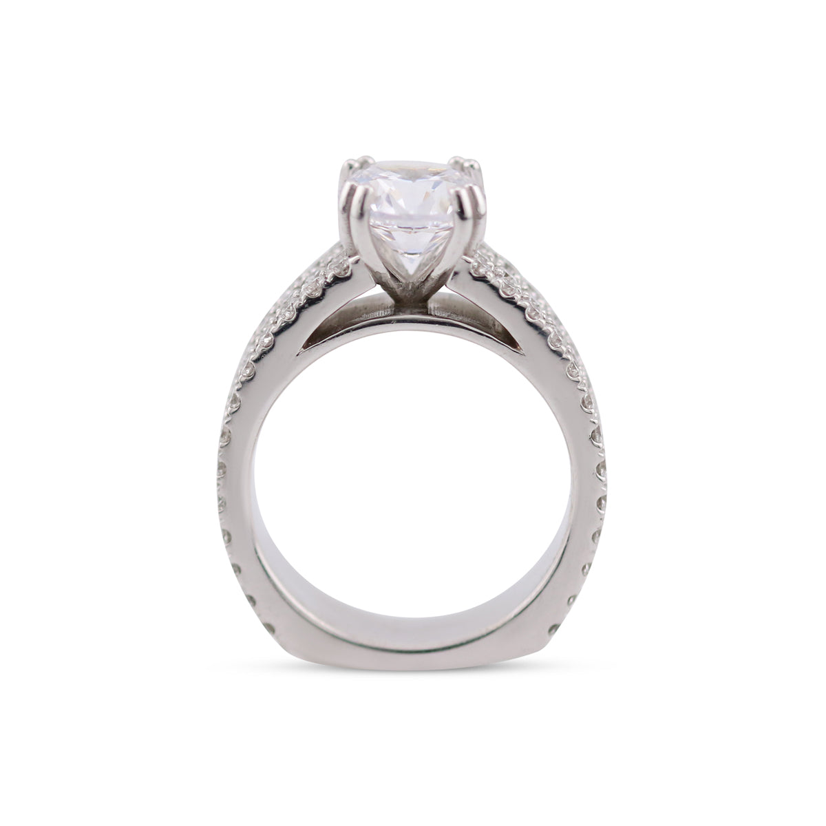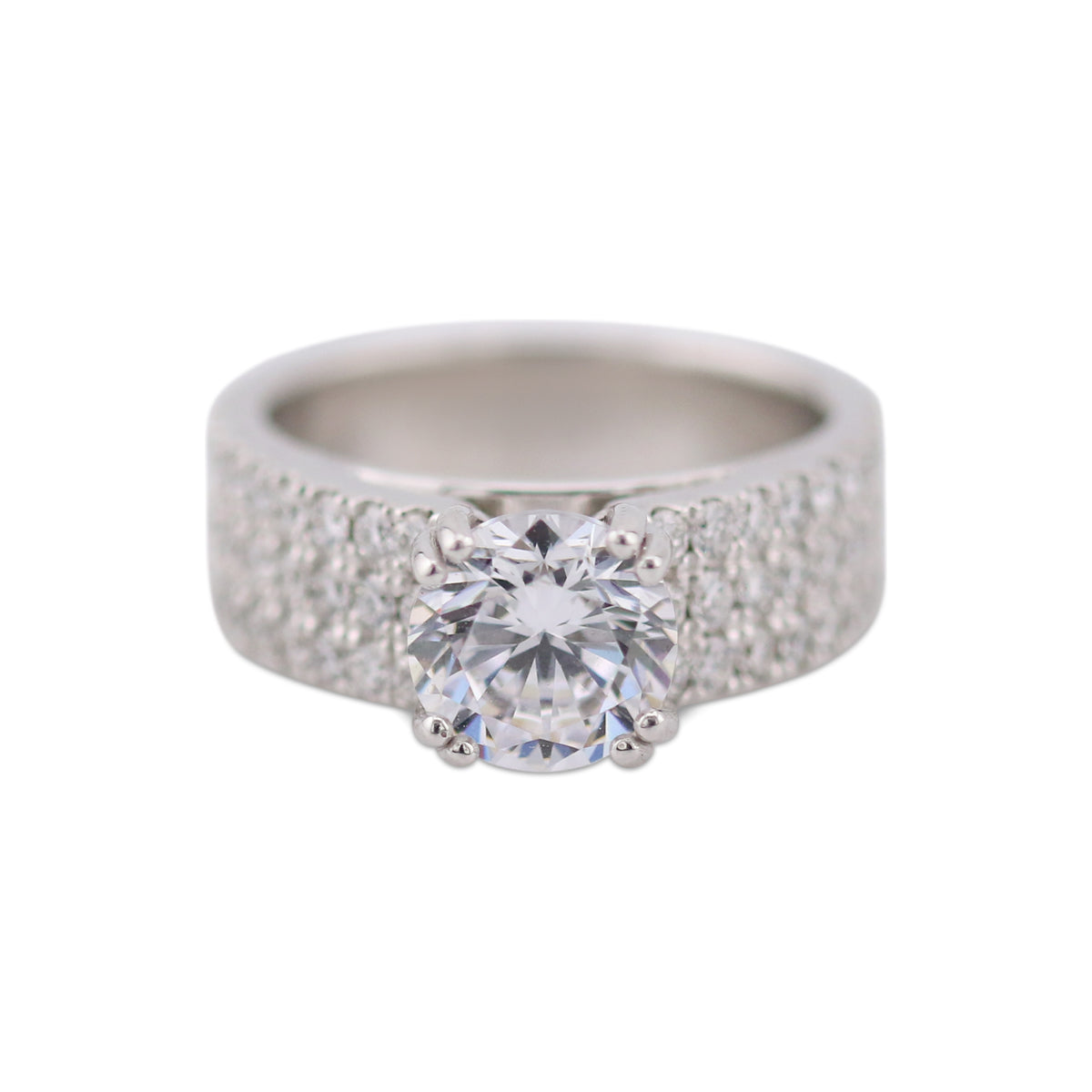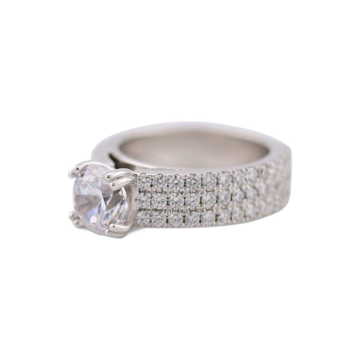 Designed as the foundation for a meaningful center stone, this fourteen karat white gold mounting offers refined brilliance and balance. A wide, three row band of 1.60 carats of shimmering diamonds creates depth and presence, while the elevated prong setting is crafted to showcase the diamond or gemstone of your choice.