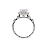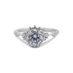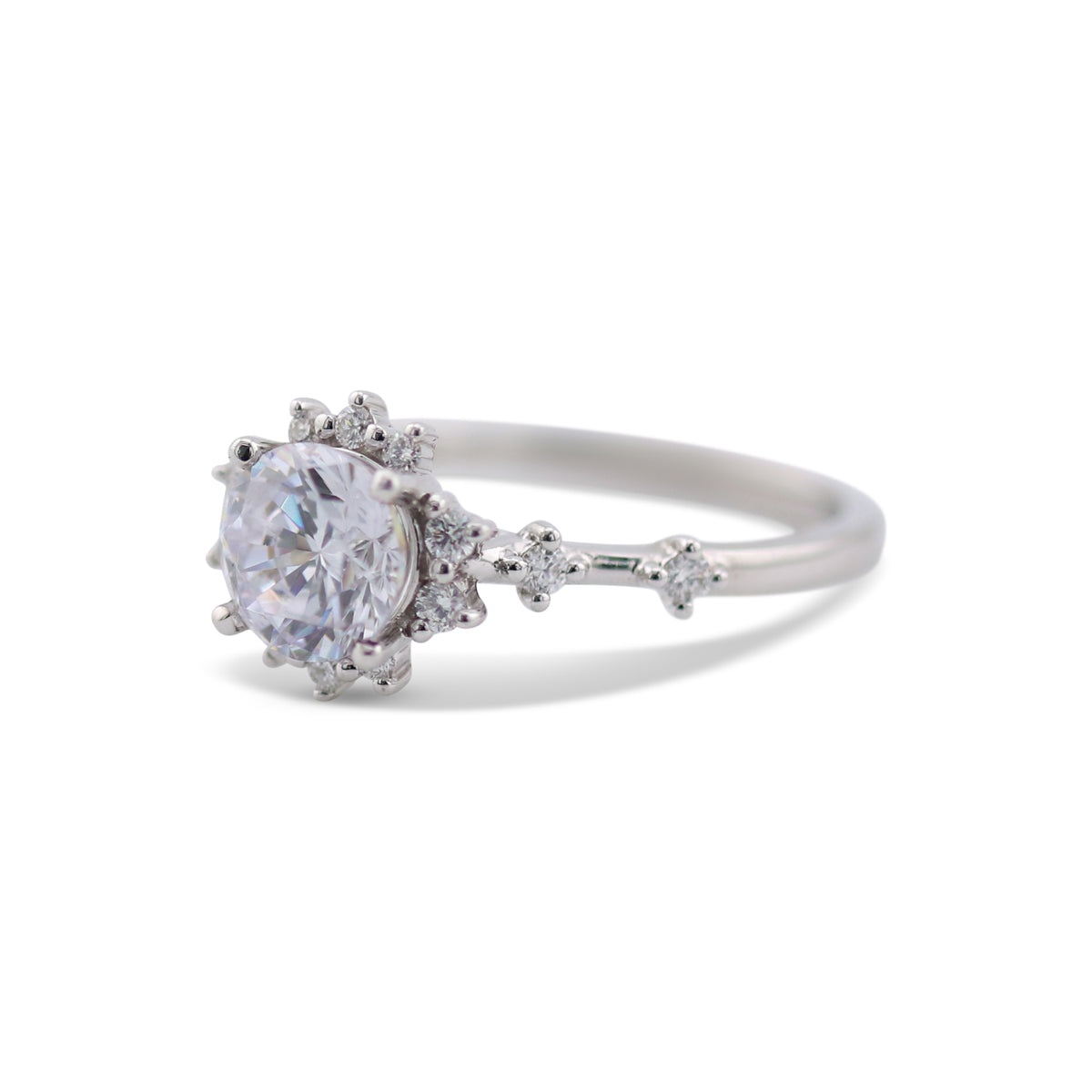 A radiant center stone is framed by delicate clusters, creating a soft, star like shimmer along the band. Crafted in fourteen karat white gold, this design feels both graceful and expressive, offering a refined balance of brilliance and individuality for meaningful moments.
