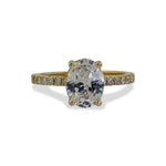 Timeless elegance defines this classic oval engagement style ring. A softly contoured oval center stone is enhanced by a discreet hidden halo, adding depth and gentle brilliance without overwhelming the design. Diamond accents line the slender band, while yellow gold brings warmth and balance—an enduring silhouette crafted to celebrate refined romance and everyday sophistication.